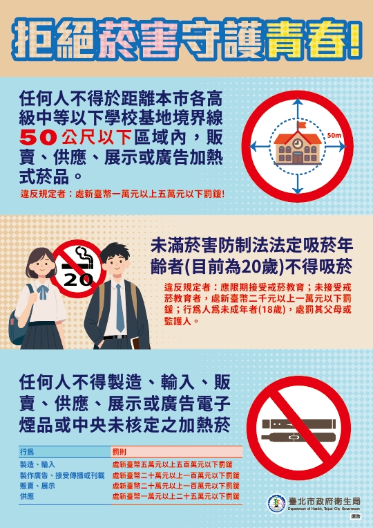 2家加熱菸業者產品即將合法上市,為避免青少年誤認其無害或產生好奇而接觸,本局特製作宣導海報,提升本市高中職以下學校學生菸害防制知能及瞭解菸害防制法相關罰則。