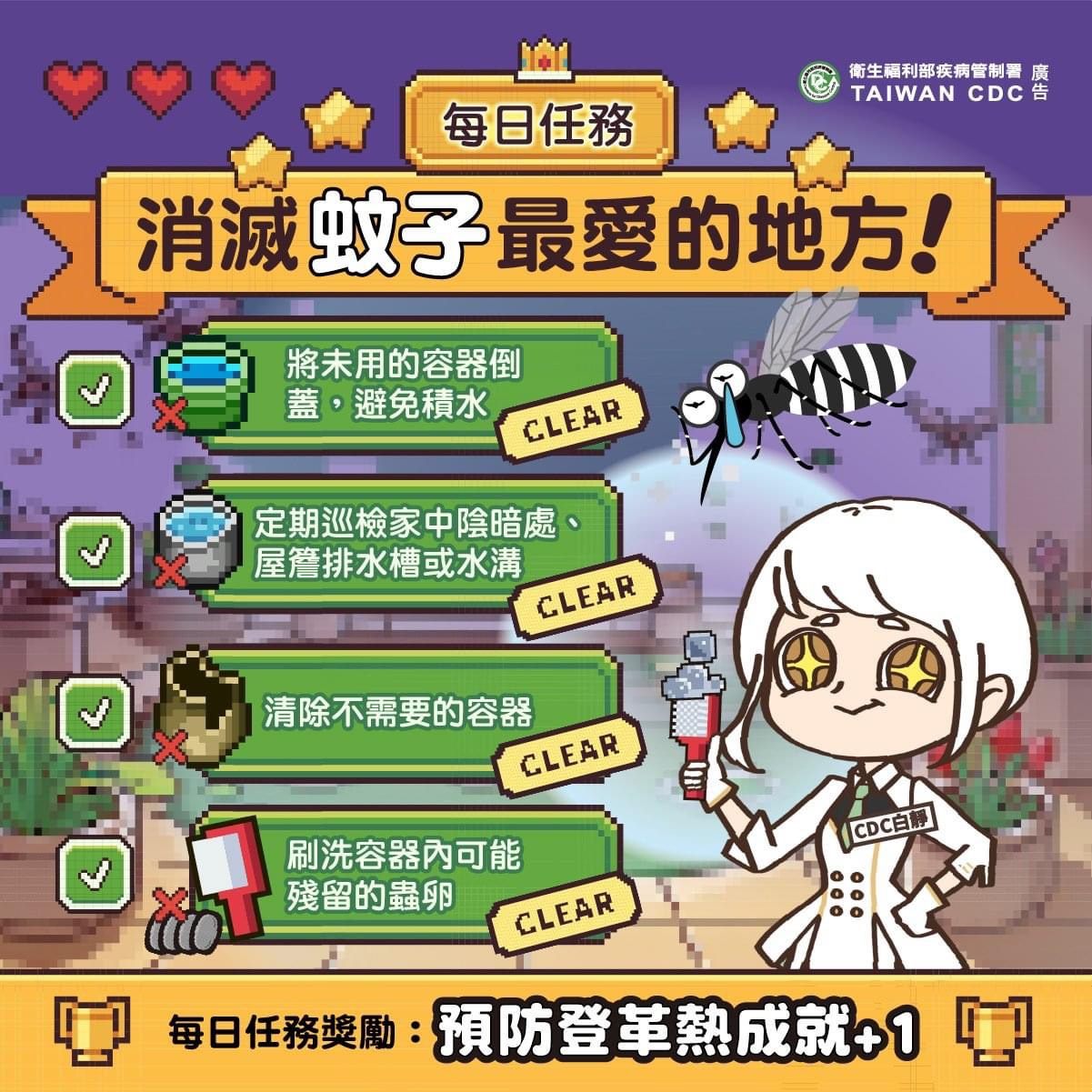 目前正值登革熱流行期,近期天氣型態適合病媒蚊生長與活動,登革熱傳播風險上升,請各機關學校落實環境管理,並加強向民眾衛教宣導,澈底清除校園、機關、