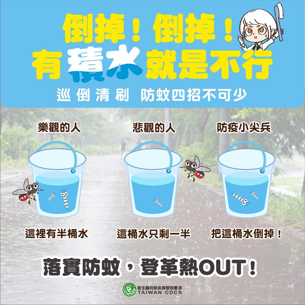 家戶內外孳生源,於降雨過後再次巡檢環境;如民眾出現發燒、頭痛、後眼窩痛、肌肉關節痛或出疹等登革熱疑似症狀,應儘速就醫,並主動告知醫師近期旅遊活動史。