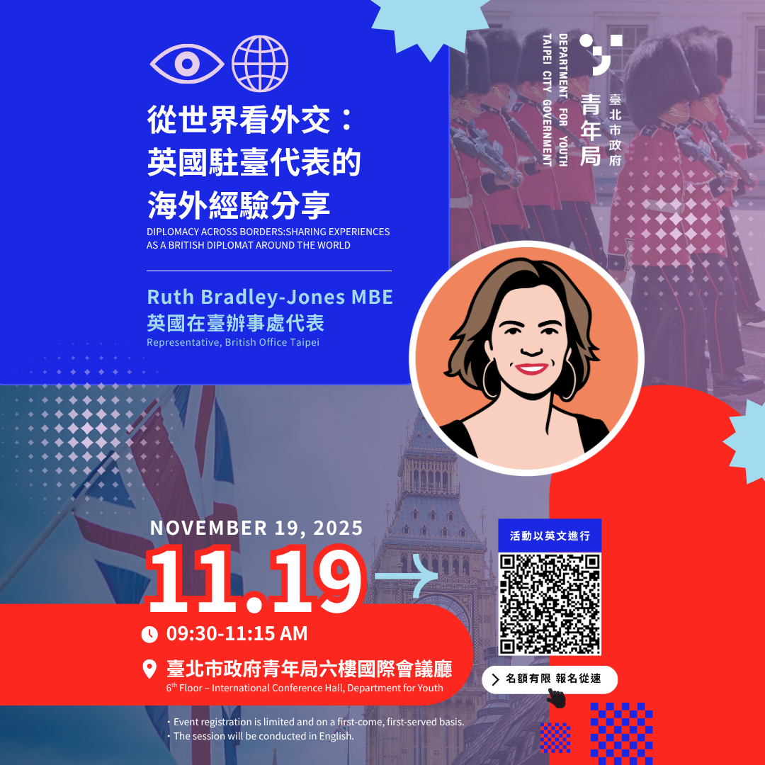 本次活動將由英國駐臺代表分享其在全球各地外交工作的經驗與見聞,帶領青年從世界視角理解外交工作的挑戰與使命。活動全程以英語進行,名額有限,採先報名先錄取制。