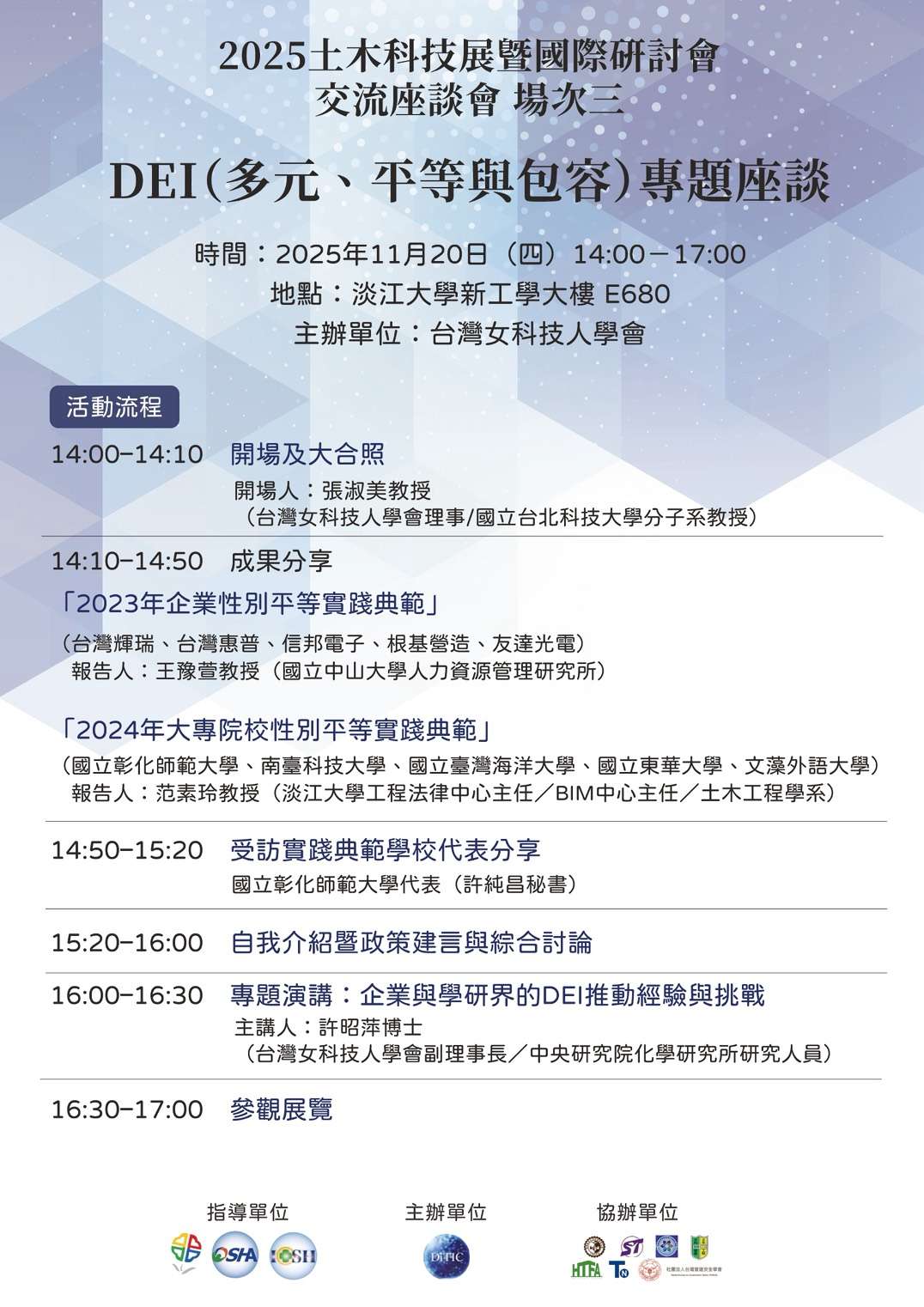 (一)旨揭論壇為「土木科技展暨國際研討會」場次三活動,聚焦多元、平等與包容(DEI)相關議題,包含企業實務、大專校院推動成果、跨領域交流及展覽導覽。