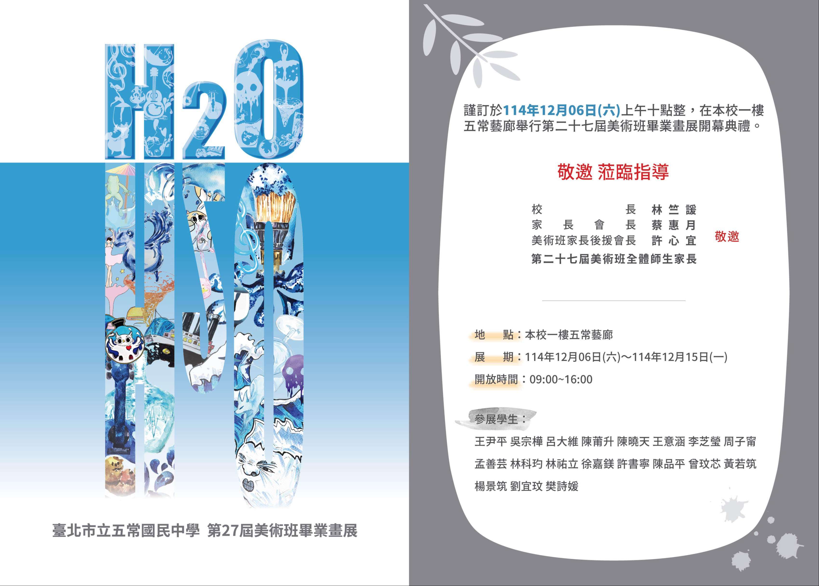 一、臺北市立五常國民中學辦理第27屆美術班畢業畫展,旨在呈現學生於藝術教育學習階段之成果,並促進藝術觀摩與交流。