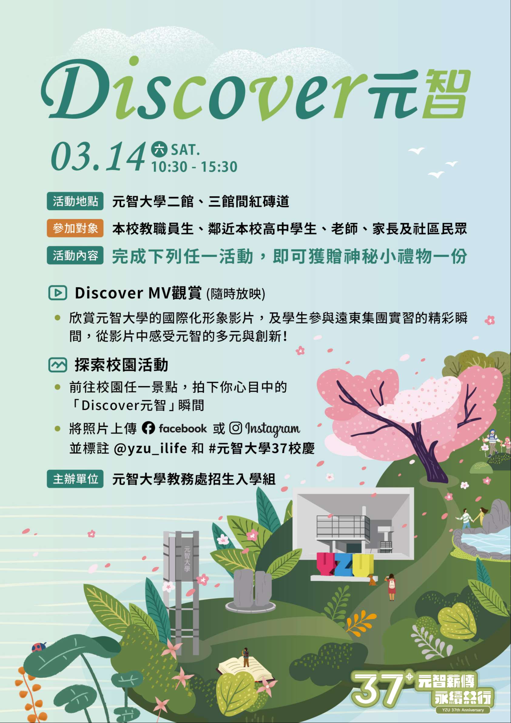 為促進社區民眾及高中學生認識元智大學校園環境與特色,特辦理「Discover元智」校園探索活動,歡迎踴躍參加。