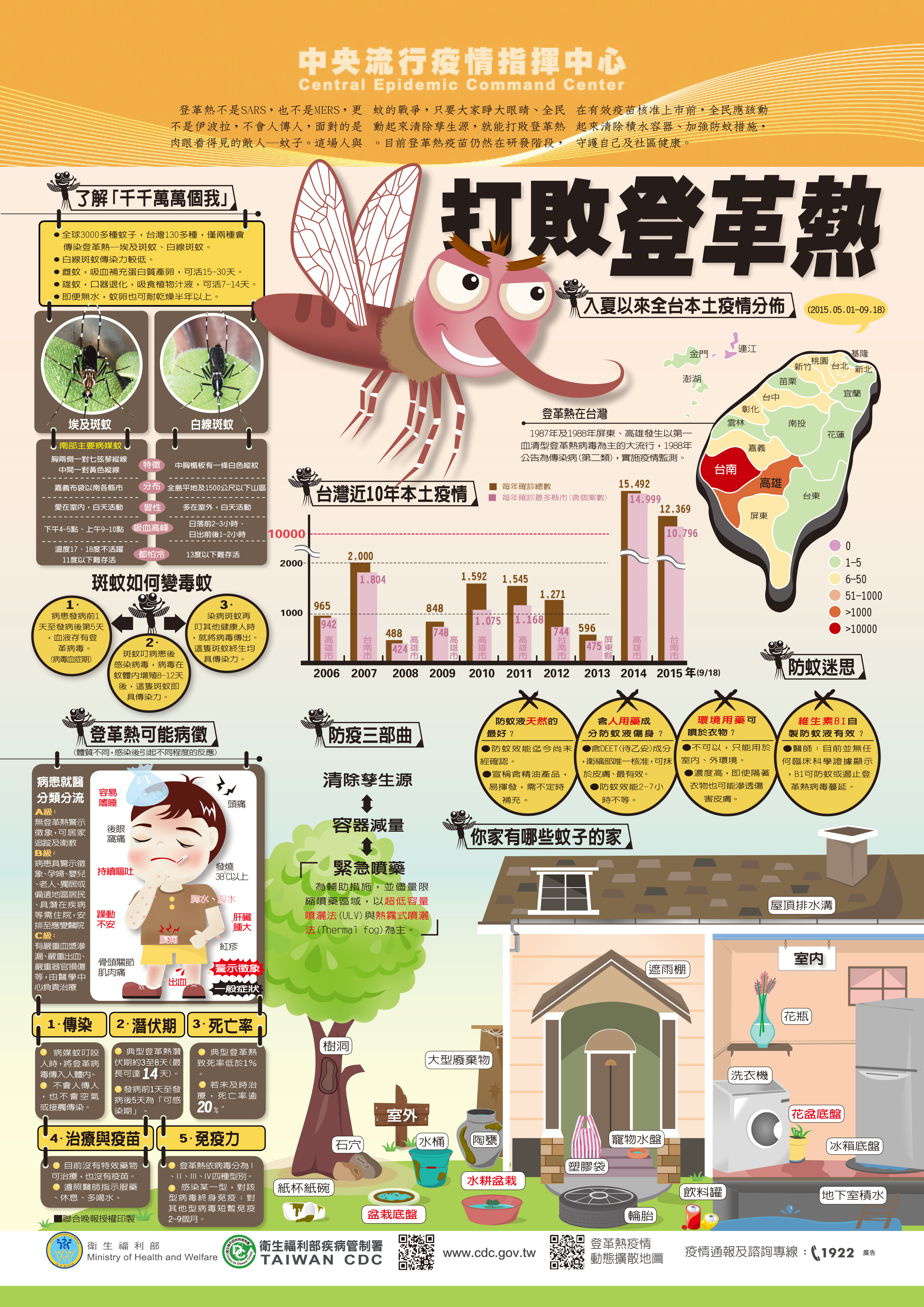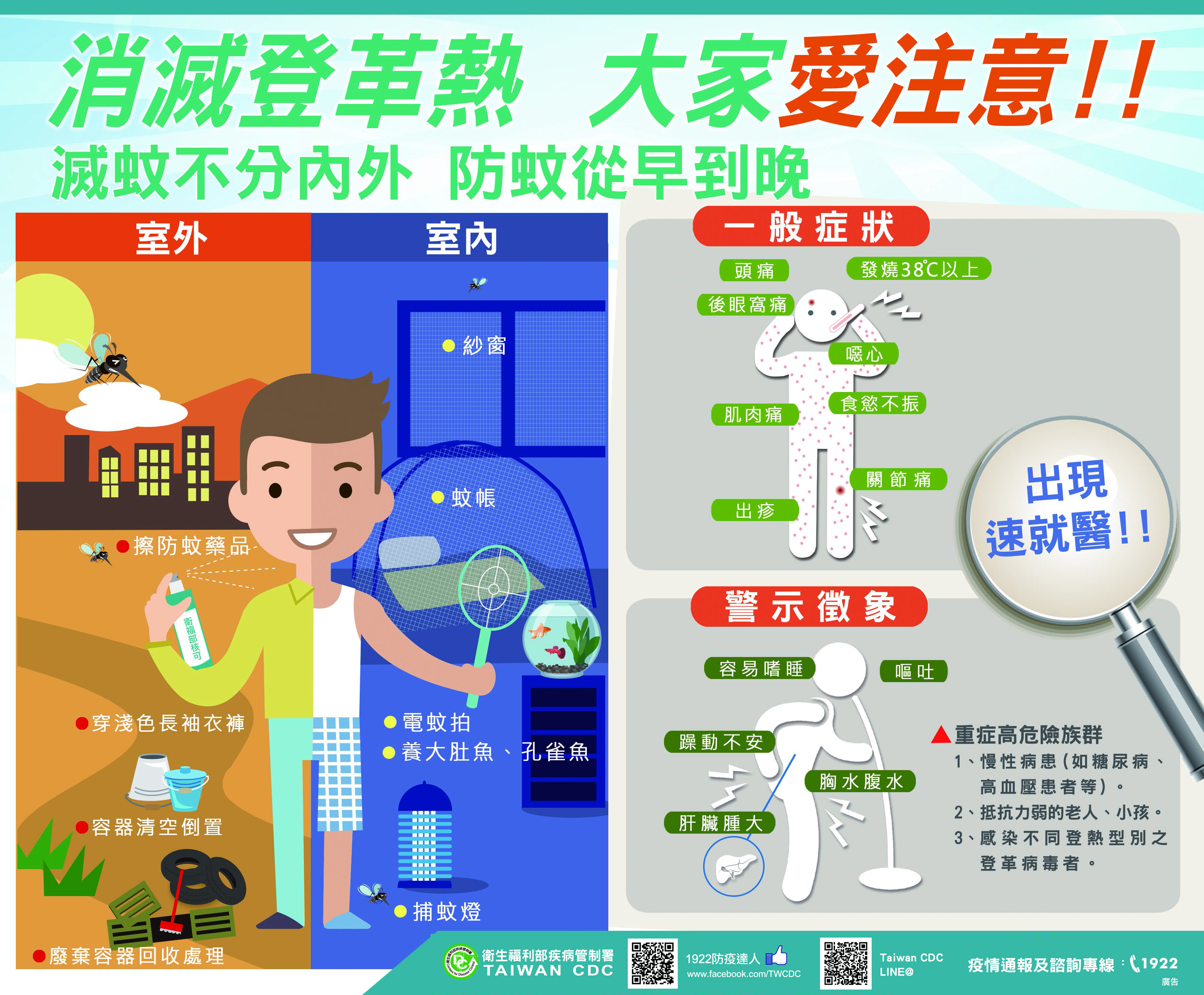 放假期間如前往登革熱流行地區活動或旅遊,務必穿著淺色長袖衣褲並使用防蚊液等防蚊措施,返國(家)後應自我健康監測14日。