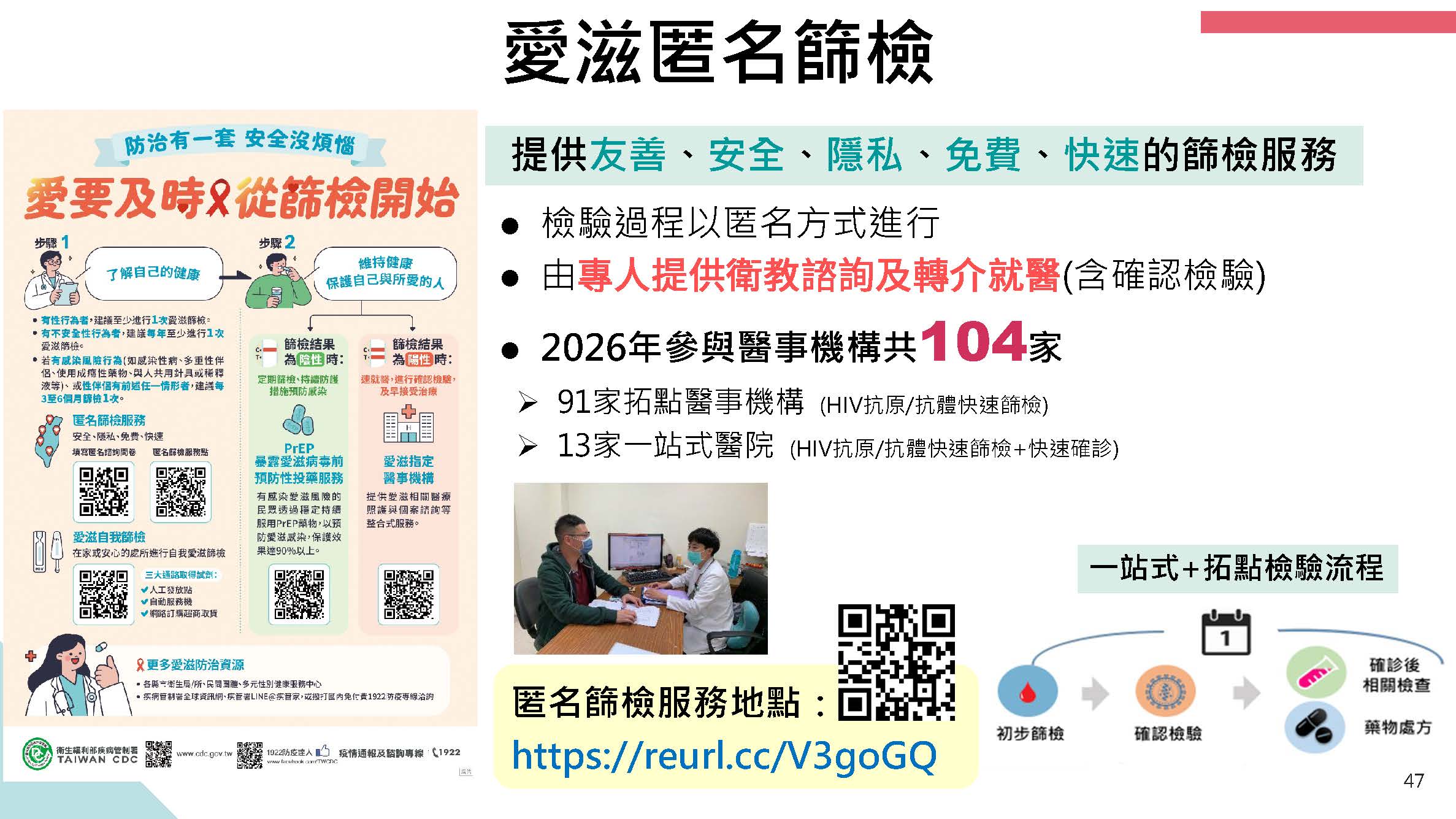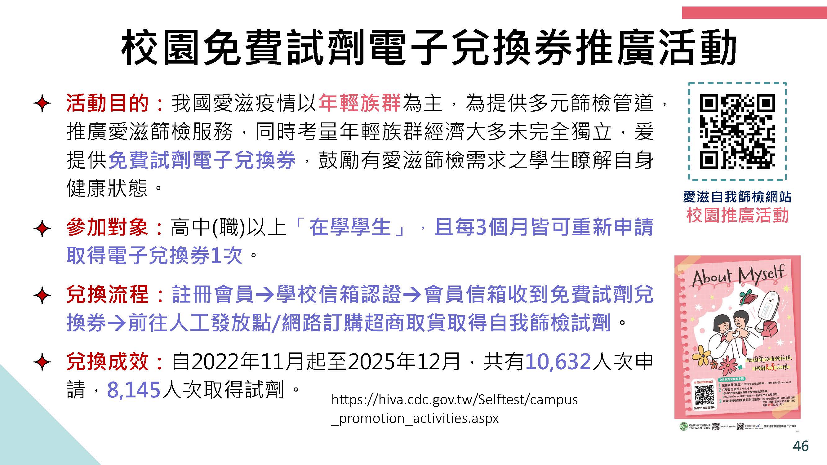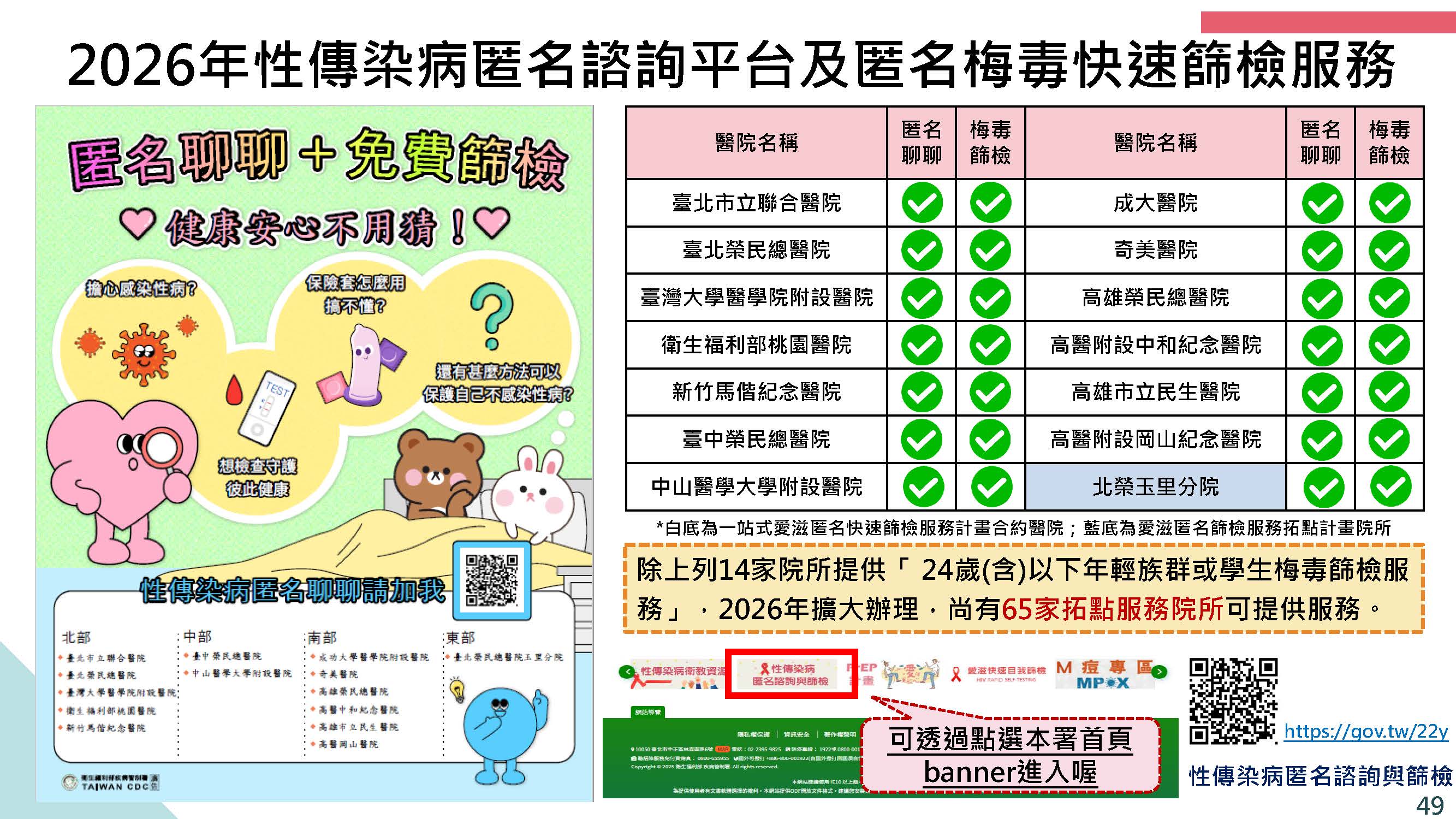 三、為整合及提供更多元且具實務應用之衛教資源,疾管署已彙整相關單位製作之性傳染病防治衛教宣導素材,並置於該署全球資訊網「性傳染病衛教資源專區」(https://www.cdc.gov.tw/),請於辦理校園愛滋及性傳染病防治衛教或相關宣導活動時,依宣導需求選擇運用。另疾管署亦提供「性傳染病匿名諮詢」及「24歲(含)以下年輕族群或學生梅毒快速篩檢服務」,請逕至前開網站「性傳染病匿名諮詢與篩檢」專區查詢及下載推廣運用。