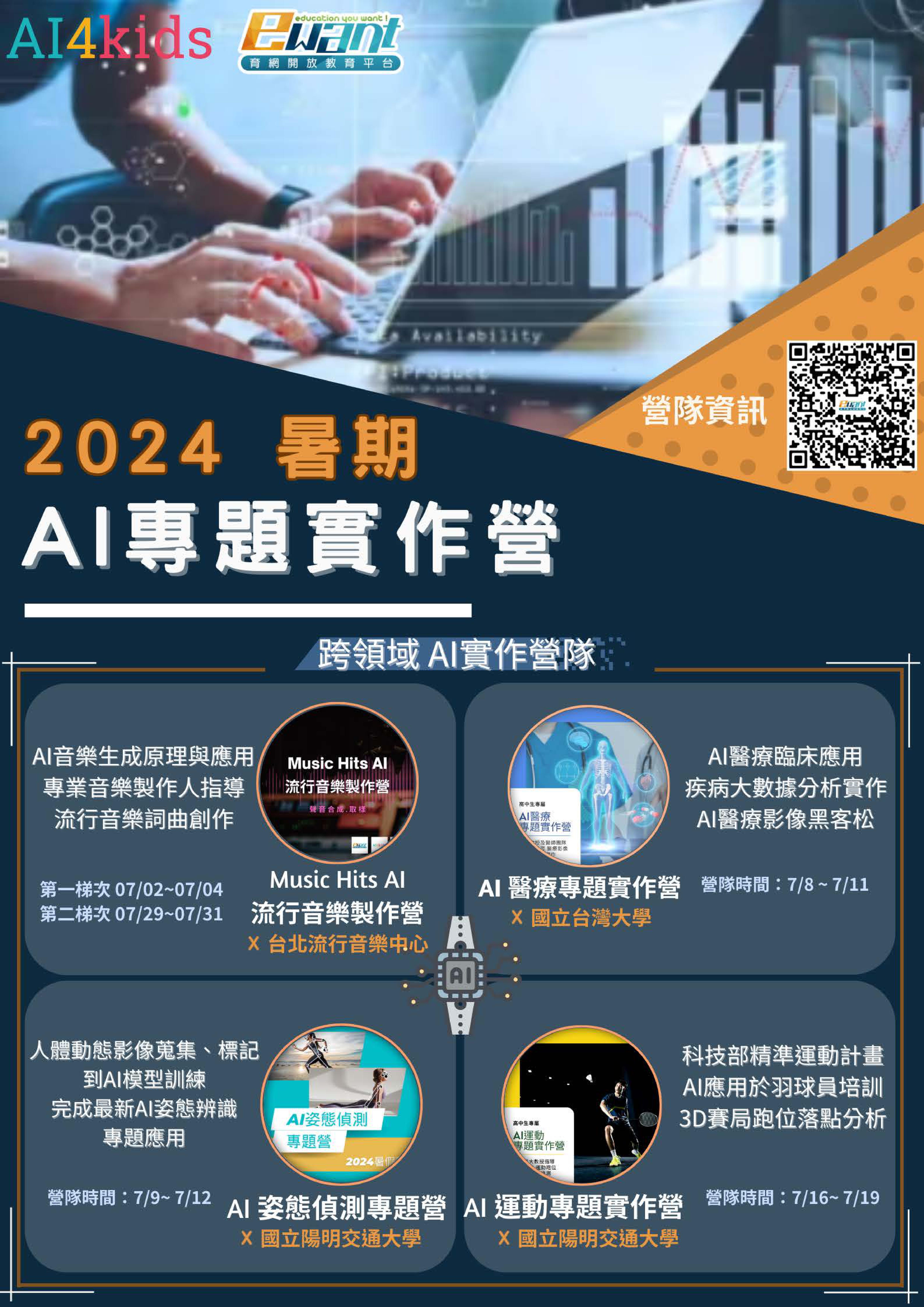 三、本期開課課程包含:Music Hits AI流行音樂製作營、AI醫療專題實作營、AI運動專題實作營、AI姿態辨識專題實作營,檢附活動電子海報,或可參考AI專題實作營隊網站: https://reurl.cc/OMkmeR。